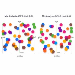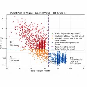 The chart segments products by price–volume performance to identify marginleakage, discount inefficiencies, and premium opportunities.