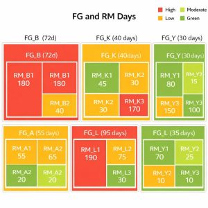 This treemap shows Finished Goods inventory days alongside their underlying RawMaterial exposure, making it easy to identify FG risks driven by specific RMoverstock or shortages.