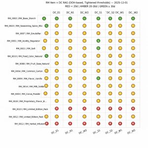 This RAG heatmap highlights raw materials at stock-out risk across distributioncenters based on days-of-holding, enabling proactive replenishment and riskmitigation.