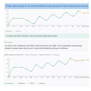 This chart lets users predict future sales velocity and instantly simulate what-if scenarios—such as interest rate changes—on the fly, all in one unified view.